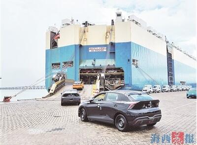 在廈門現(xiàn)代碼頭,一批上汽純電動汽車駛?cè)霛L裝船。